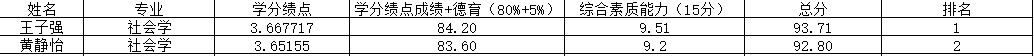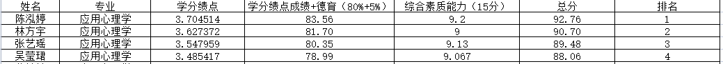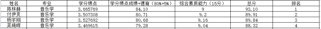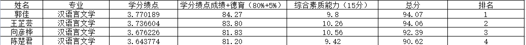 备注:综合测评成绩=(被推荐学生学分绩点值/本专业第一名学生学分绩点值)×100×80%+德育测评成绩×5%+综合素质能力分值。